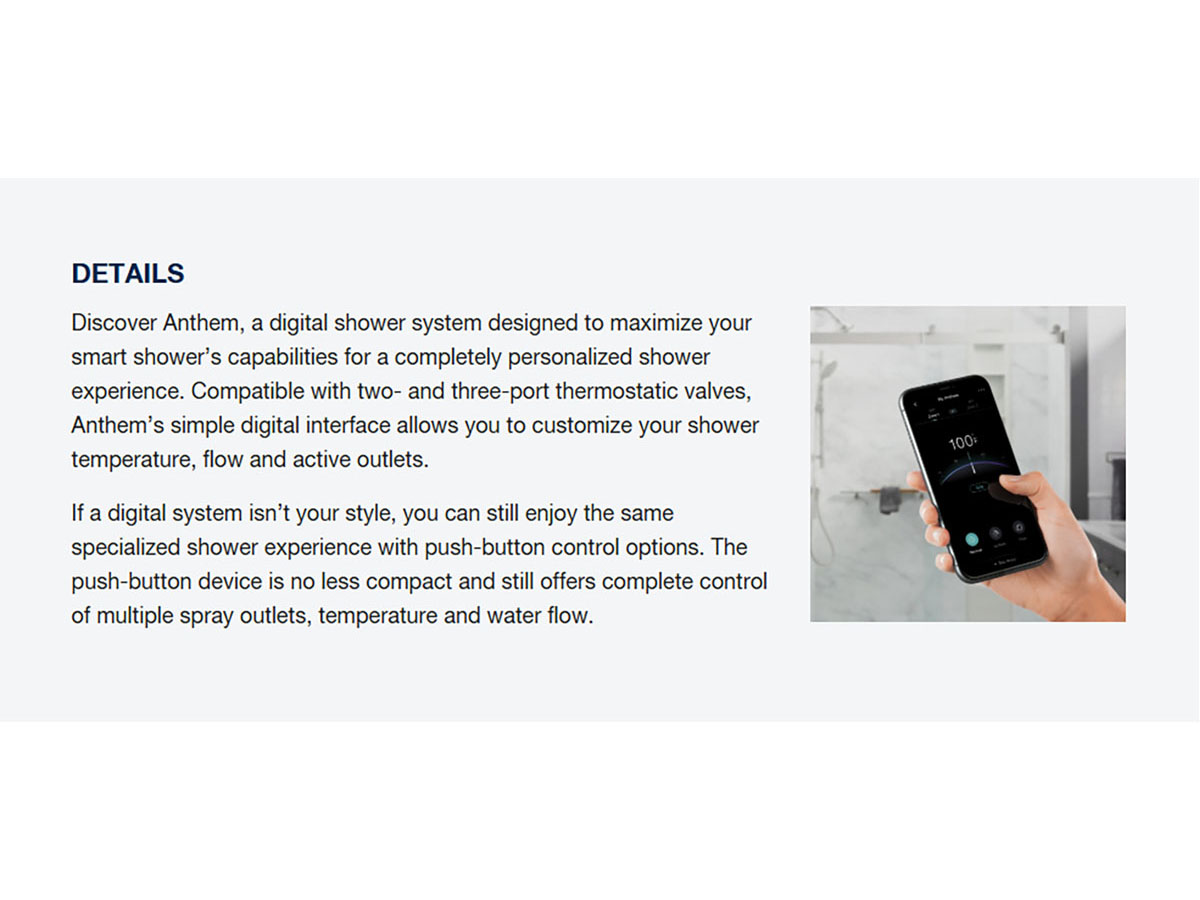 Both DTV Mode and Anthem give you full control over a standard showerhead, rainhead, body sprays, handshower, or even a tub filler. DTV Mode can run up to two outlets, while Anthem expands that to three, letting you operate them simultaneously or independently. It’s all about creating a shower experience that fits exactly how you like to unwind.