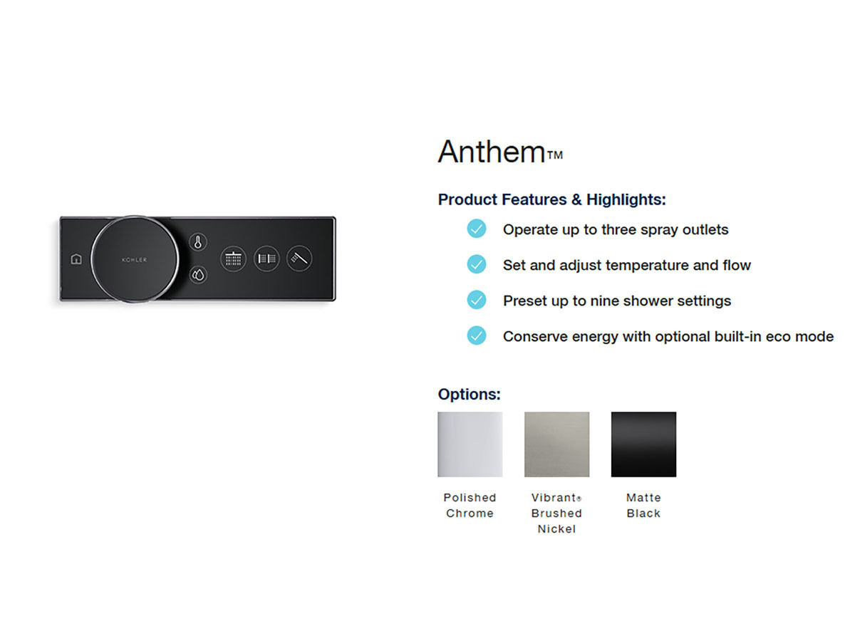 Anthem puts complete control of your shower at your fingertips. With simple push-button or digital controls, you can manage up to three spray outlets, fine-tune your water temperature, and adjust flow with precision. And with the KOHLER Konnect app, you can control it all from your smartphone, so your shower is ready exactly how you like it, every time.