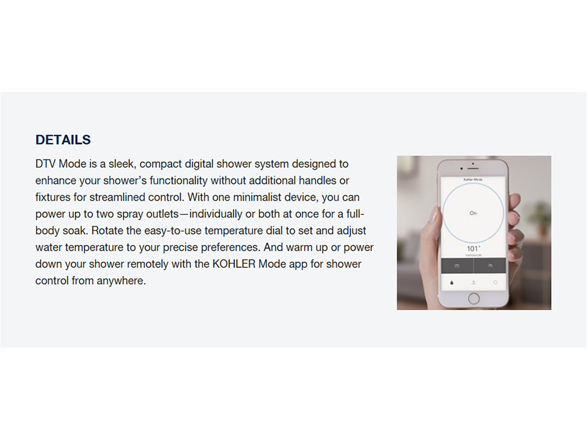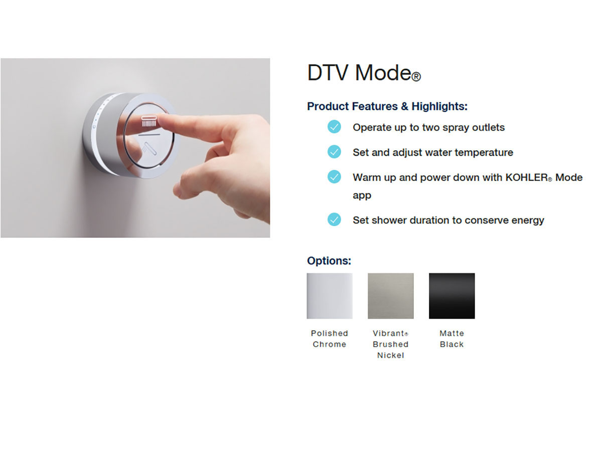 With DTV Mode, your shower starts on your terms, with the touch of a button. You can power up to two shower outlets, dial in your exact temperature, and skip the guesswork of traditional handles. And with the KOHLER Mode app, you can even control it right from your phone. So your perfect shower is ready before you step in.